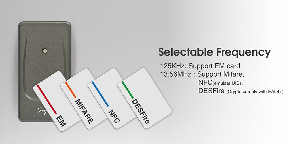 | Frequency | ISO18000-2: EM4001 and EM4095 compatible | ISO 14443 / ISO 7816-4 Mifare Ultralight, Classic, DESFire EV1, NFC (card simulation), iCASH Card |