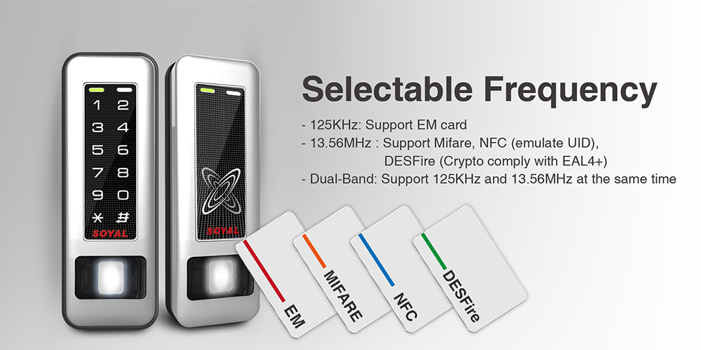 | Frequency | ISO18000-2 — EM4001, EM4095 | ISO14443/7816-4 — Mifare UL/Classic/Plus, DESFire EV1/EV2, NFC, ISO15693, Felica | 125kHz + 13.56MHz keduanya |
