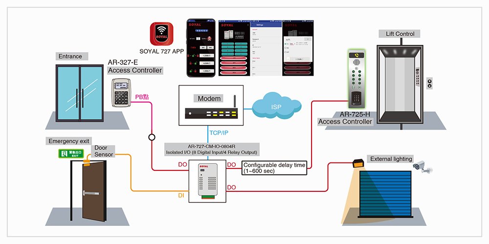 Berikut adalah diagram arsitektur, fitur visual, dan aplikasi lengkap dari Soyal AR-727-CM-IO-0804R.