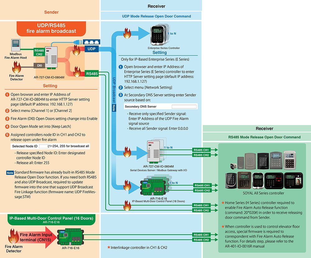- Fire Alarm Interlock: Fitur bawaan UDP broadcast dan RS485 CH1 & CH2 untuk pelepasan otomatis semua kunci pintu saat keadaan darurat kebakaran.