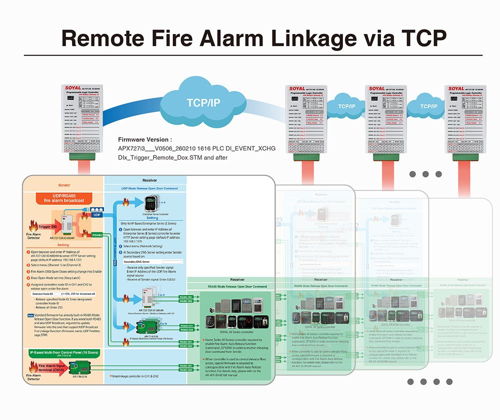 - Fire Alarm Interlock: Fitur bawaan UDP broadcast dan RS485 CH1 & CH2 untuk pelepasan otomatis semua kunci pintu saat keadaan darurat kebakaran.