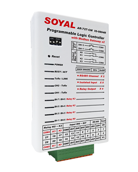 Soyal AR-727-CM-PLC-0804R adalah kontroler logika terprogram (PLC) mini berbasis web yang dirancang untuk otomasi gedung cerdas dan sistem kontrol I/O. Dilengkapi HTTP Server bawaan yang memungkinkan pemrograman langsung melalui browser tanpa memerlukan antarmuka HMI terpisah.
