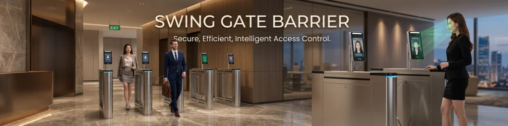 Swing barrier gate adalah pintu akses otomatis dengan panel yang berayun membuka-menutup seperti pintu biasa, dikendalikan secara elektronik melalui RFID, QR code, atau biometrik. Desainnya elegan dengan panel akrilik atau kaca tempered.