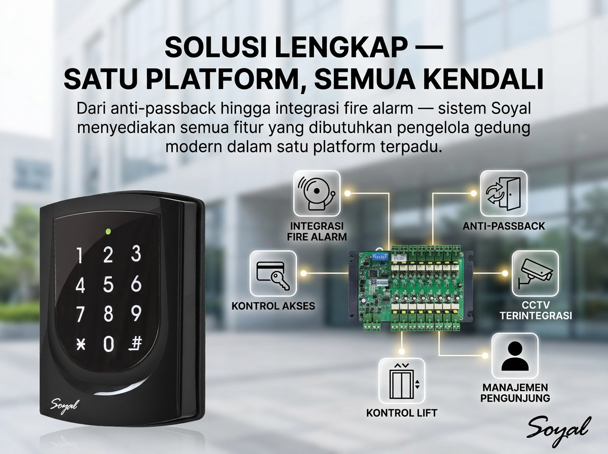 Dari anti-passback hingga integrasi fire alarm — sistem Soyal menyediakan semua fitur yang dibutuhkan pengelola gedung modern dalam satu platform terpadu.
