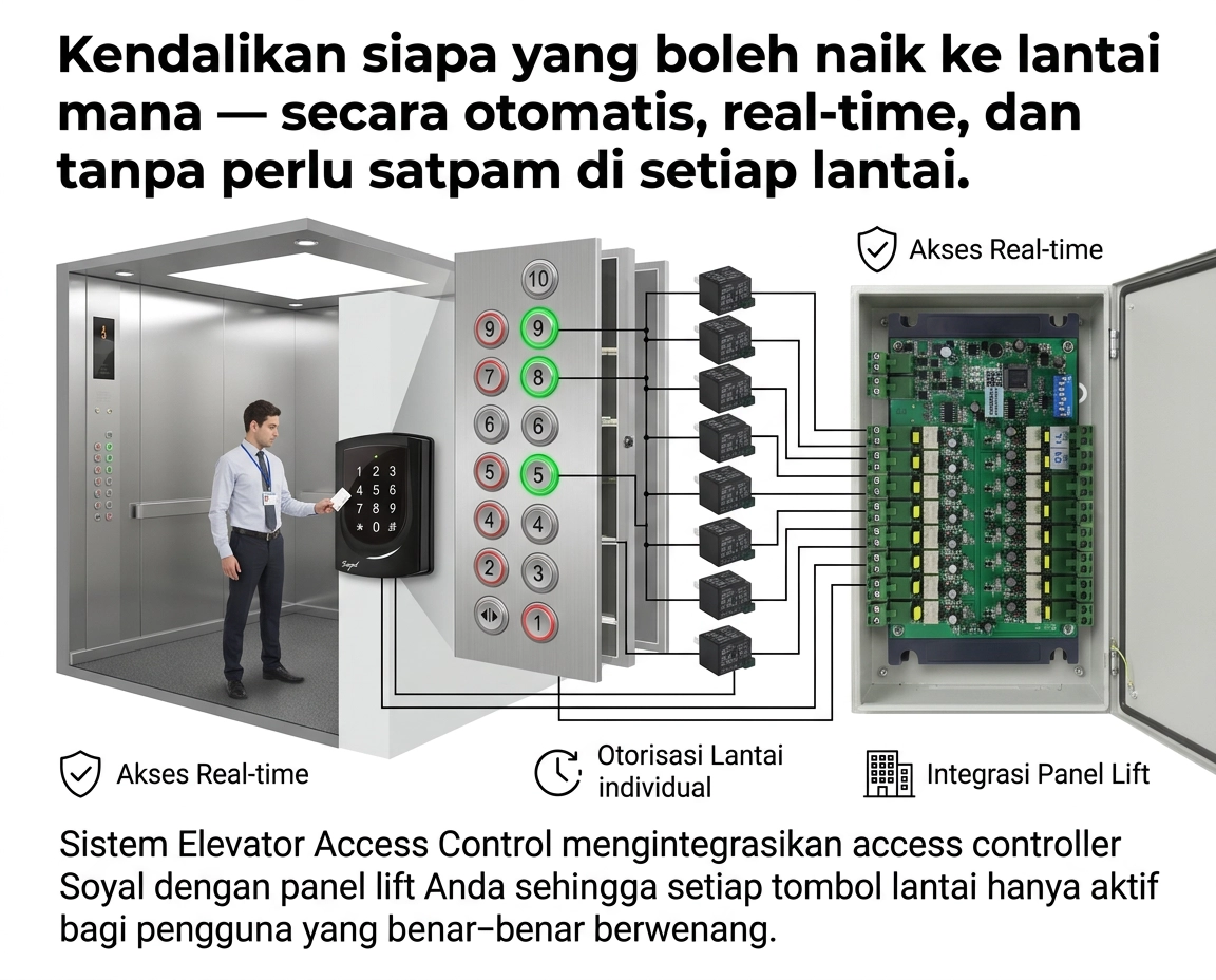 Kendalikan siapa yang boleh naik ke lantai mana — secara otomatis, real-time, dan tanpa perlu satpam di setiap lantai. Sistem Elevator Access Control mengintegrasikan access controller Soyal dengan panel lift Anda sehingga setiap tombol lantai hanya aktif bagi pengguna yang benar-benar berwenang.