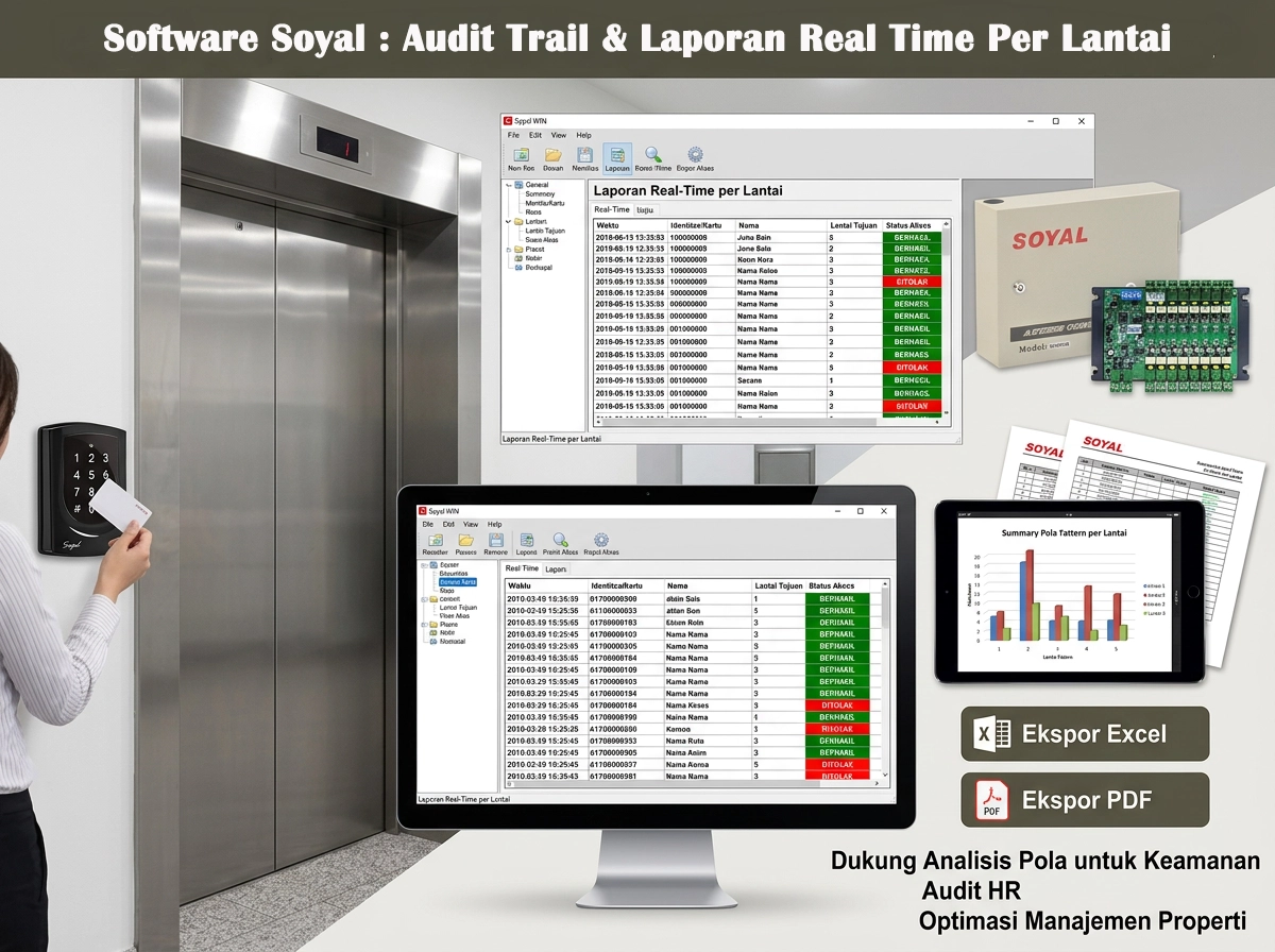 Software Soyal mencatat setiap event secara lengkap: siapa yang naik ke lantai mana, pada jam berapa, dan apakah aksesnya berhasil atau ditolak. Laporan bisa diekspor ke Excel atau PDF, mendukung analisis pola pergerakan orang di gedung untuk keperluan keamanan, HR, maupun property management.