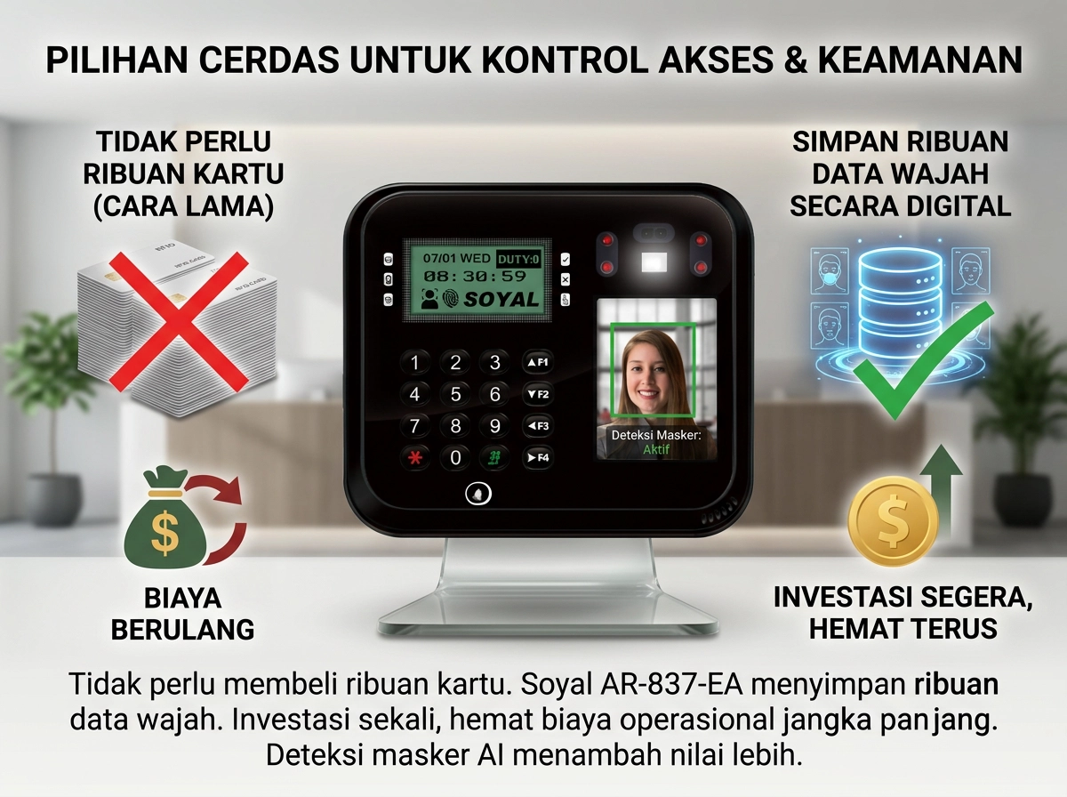 Tidak perlu membeli ribuan kartu. Soyal AR-837-EA menyimpan ribuan data wajah. Investasi sekali, hemat biaya operasional jangka panjang. Deteksi masker AI menambah nilai lebih.