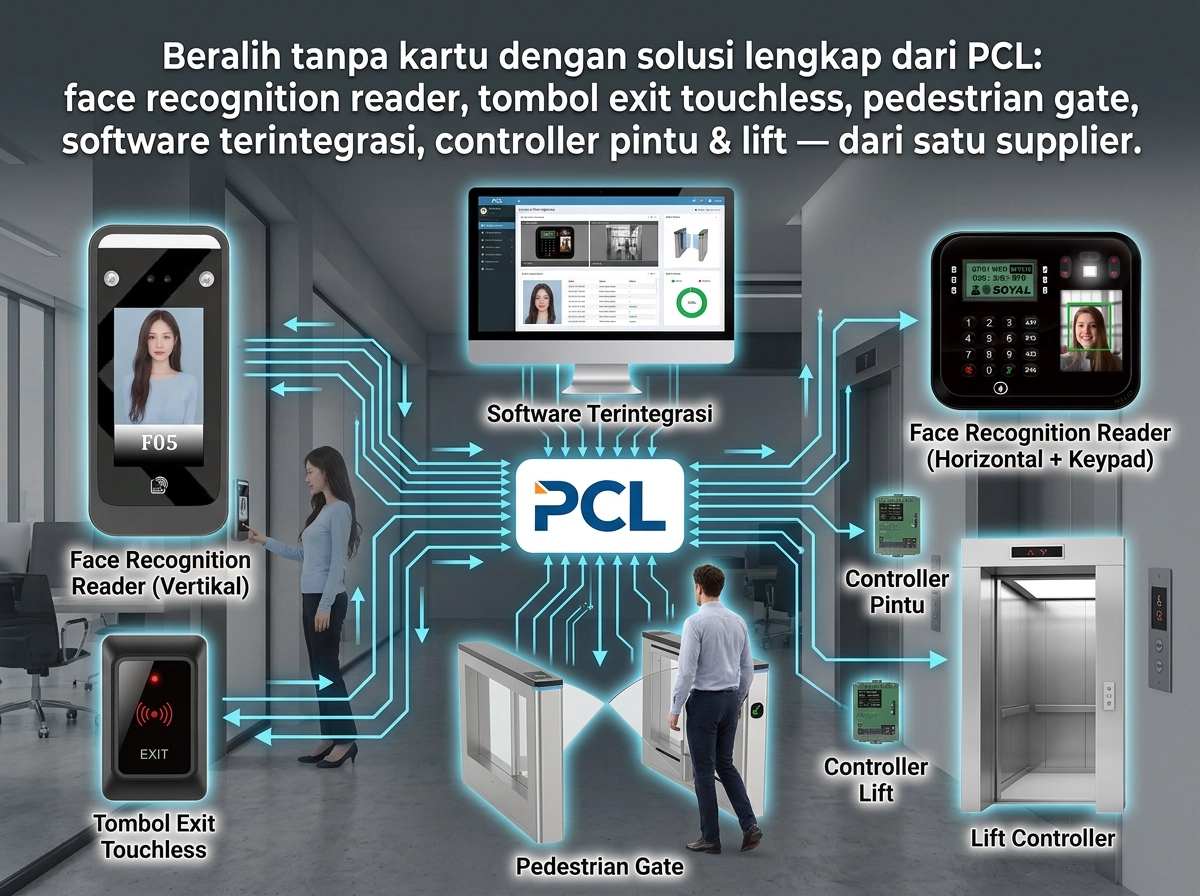 Beralih tanpa kartu dengan solusi lengkap dari PCL: face recognition reader, tombol exit touchless, pedestrian gate, software terintegrasi, controller pintu & lift — dari satu supplier.