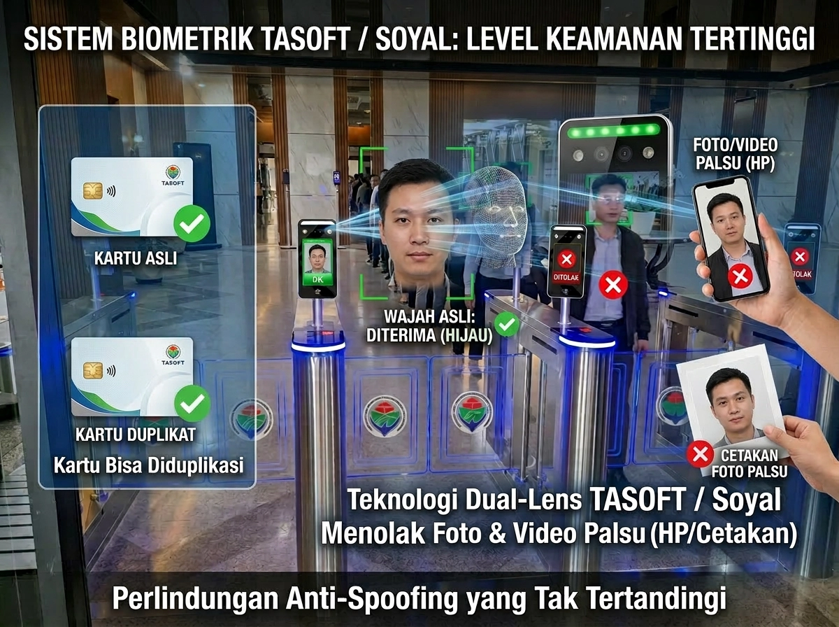 Kartu bisa diduplikasi, wajah tidak bisa. Teknologi dual-lens Soyal menolak foto dan video palsu dari handphone maupun cetakan. Level keamanan biometrik tertinggi.